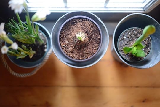 And I line up that newly planted pot with a trio of other bulb-planted pop, all in different stages of growth and bloom — and I kneel over to touch that one amaryllis shoot already rising up toward the light.