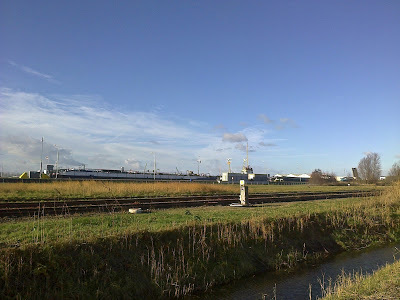 This morning, though, I woke to the relief of brilliant sunshine. It was time to shake off the cabin fever and get out in the fresh air. Since I needed to have the valve in one of my tyres checked at the garage, we went to Terneuzen where we decided to combine operations with a walk along the dockside. We parked the car and went bundu bashing over the railway and around a ditch full of water until we could find a way to reach the quay. It was quite adventurous but well worth the effort.