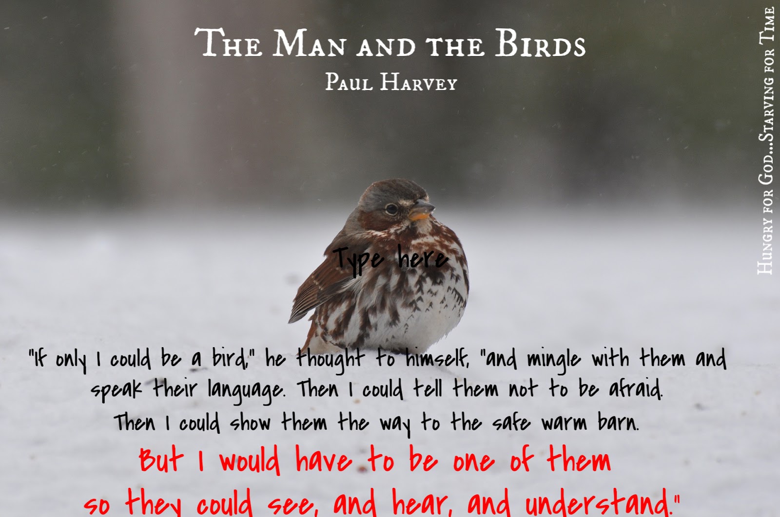 click HERE to listen to Paul Harvey's 1965 classic, "The Man and the Birds."If this post was meaningful to you, would you consider sharing it with a friend by clicking on one of the buttons below? Did you know you can receive bi-weekly Hungry for God posts sent directly to your email inbox? Visit