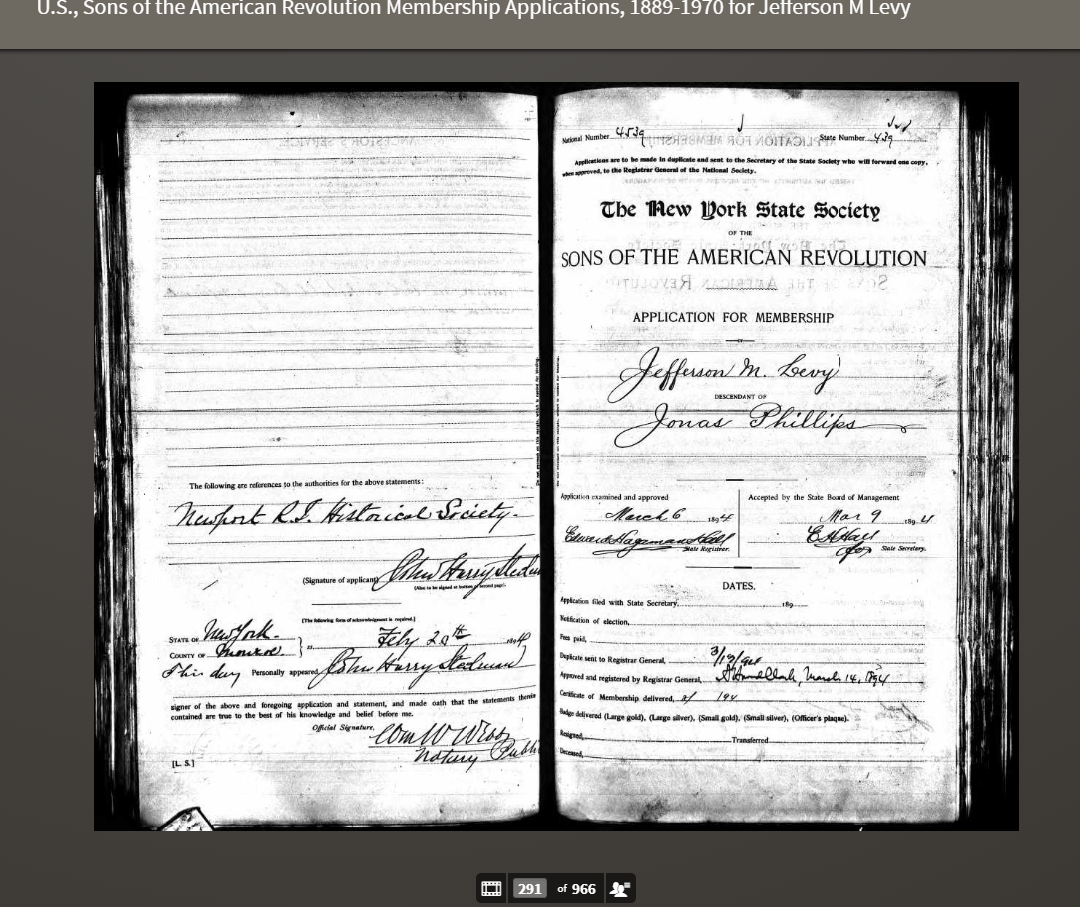 I discovered Jefferson Levy’s SAR membership when a friend and colleague, Maral Kalbian, was digging throuhg 19th century documents on line and found Jefferson Levy’s 1894 application to join the then-new SAR. The image to the left is the application’s first page.