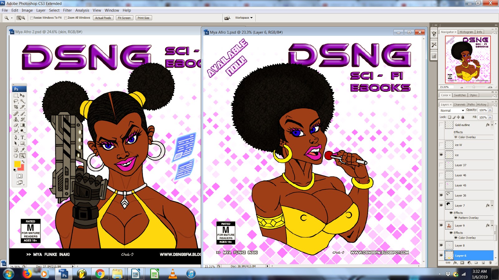 You made it!! Happy New Year guys!!!First, here’s some behind-the-scenes artwork featuring Mya Funke Inaki from the DSNG Sci fi Series! Mya is actually a former villain linked to the faction known as the Mega Wolves, but she has a loyal heart and a motherly soul. She usually sports two afro puffs, but sometimes she just lets her afro sit on her head. In some other pics, I draw her with her sci fi combat gear.