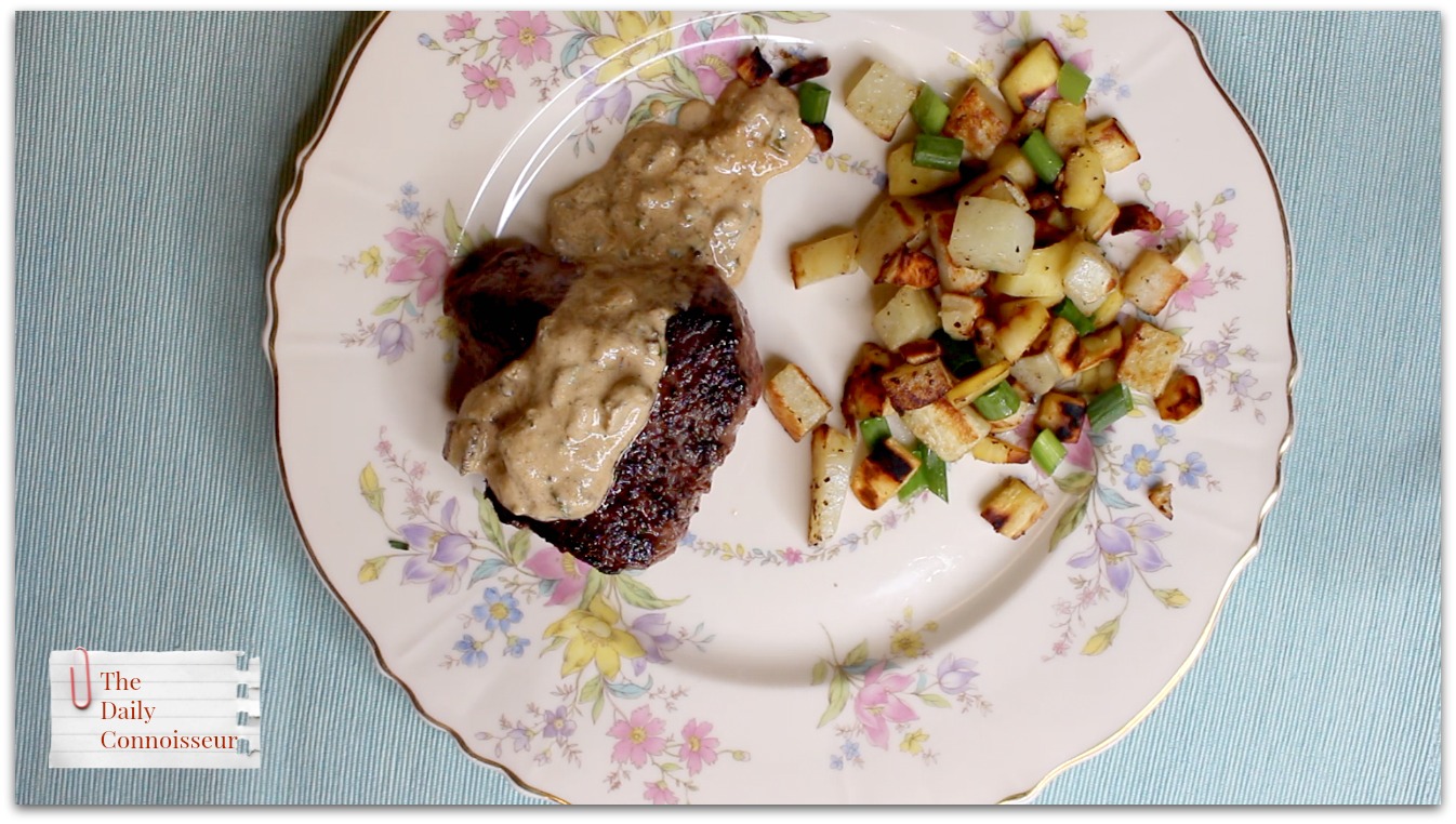 and Sirloin steak with porcini mushroom cream sauce and diced potatoes and parsnips.