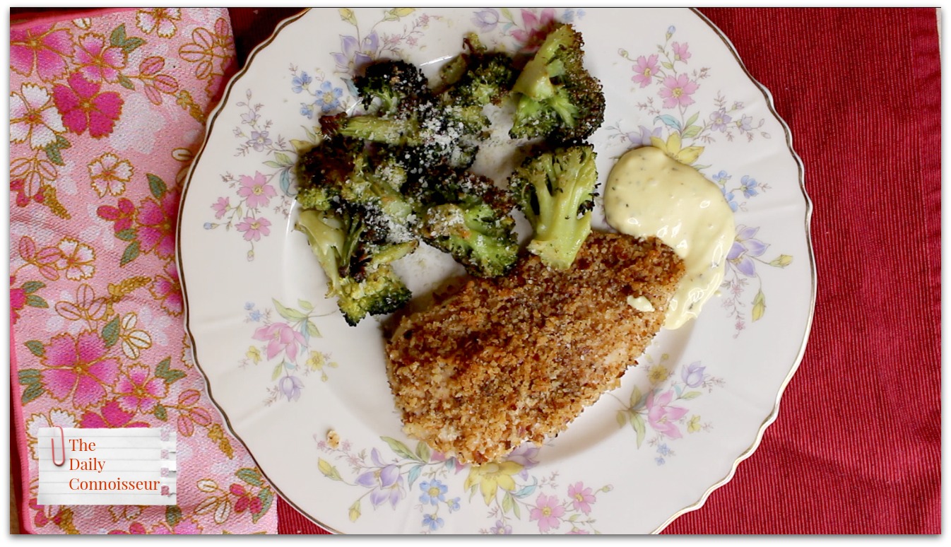 Pretzel-crusted chicken with roasted broccoli and honey mustard cream sauce (my kids' favorite).