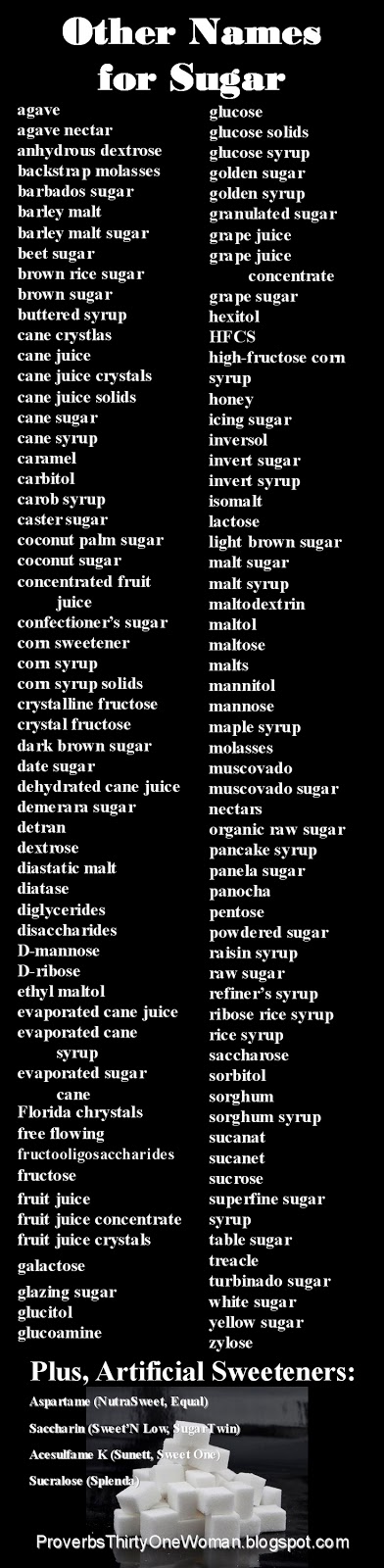 I've also created a handy In addition, you may find it helpful to know the names of common artificial sweeteners. These are man-made and are linked to health issues, including blood sugar spikes. The most common are: