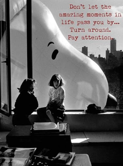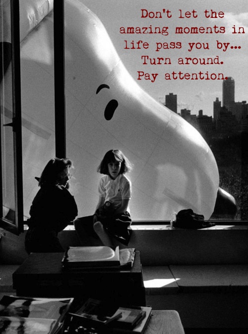 Incredible image of Snoopy through the window of the Macy's Thanksgiving Day Parade, 1988.