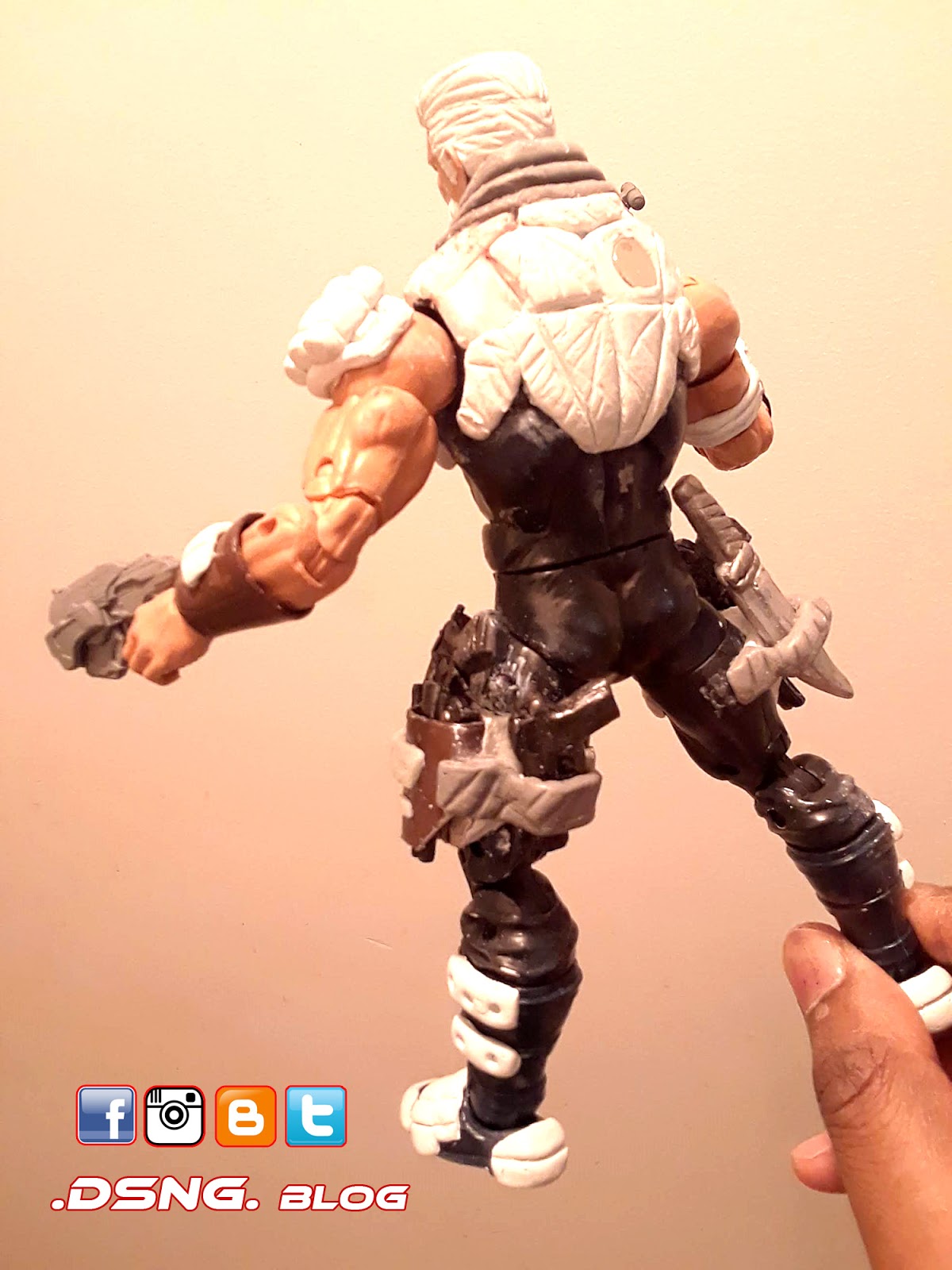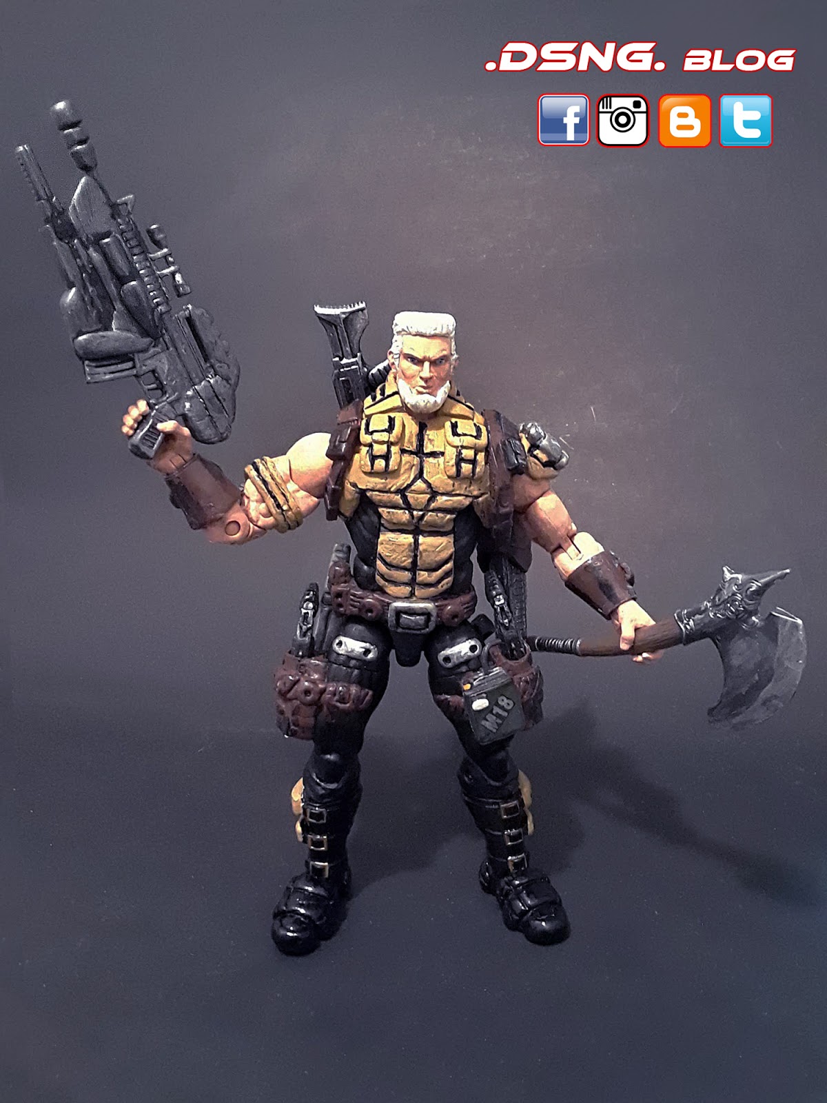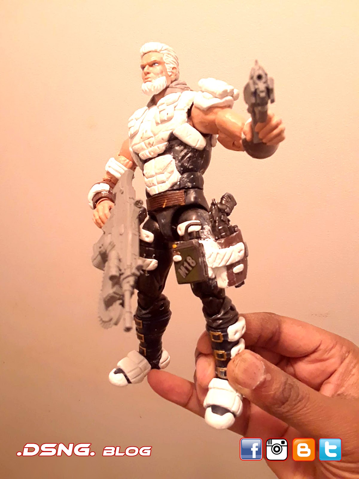 The handguns came from ebay, and one rear rifle came from a Gears Of War toy. Some of the guns were heavily modified with putty as well. His gun-vest came from Bishop and his ax weapon came from Thor, the base model.