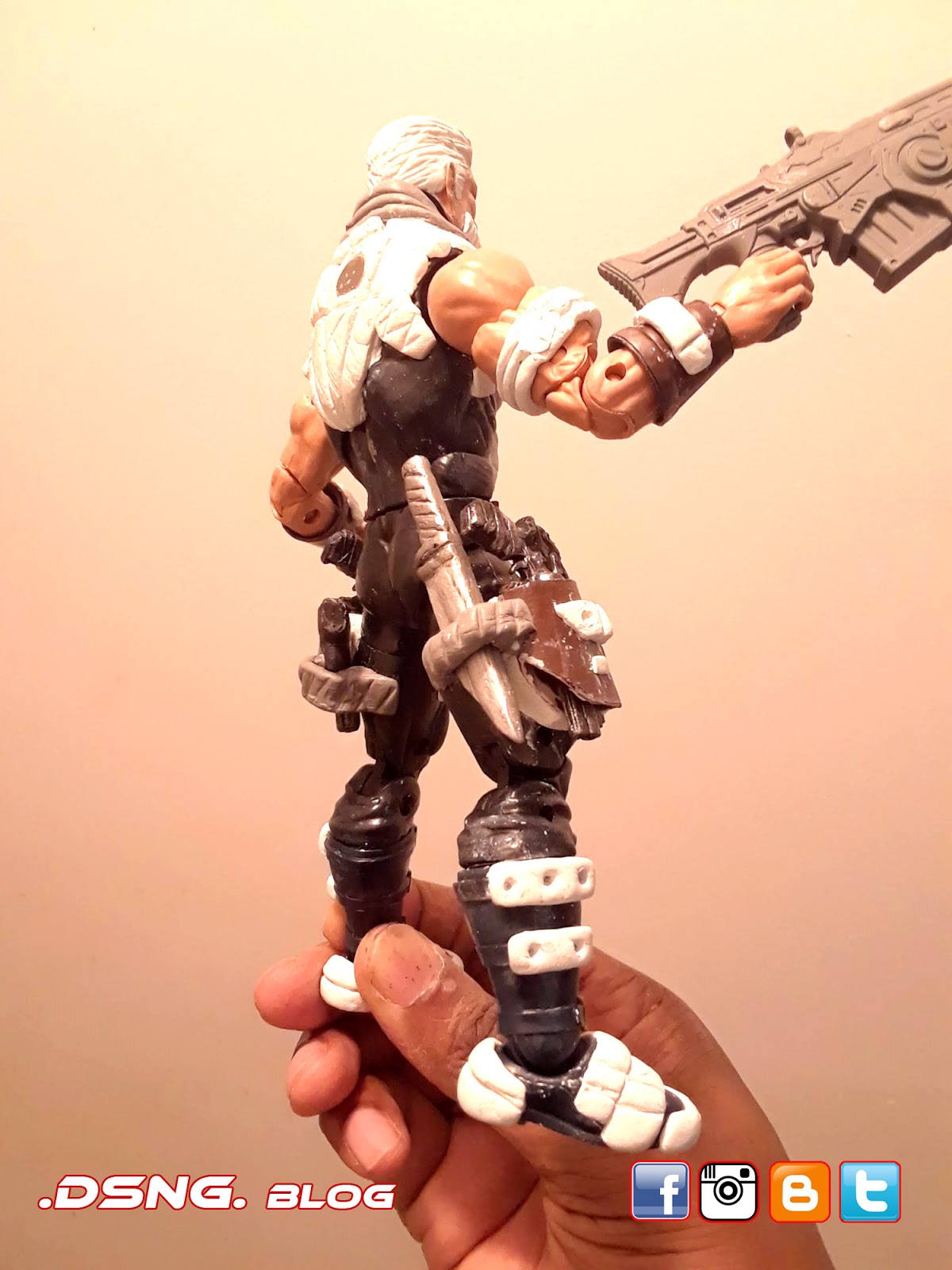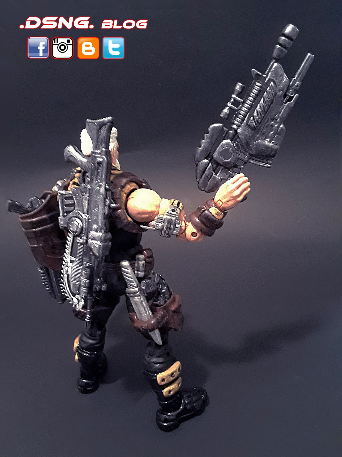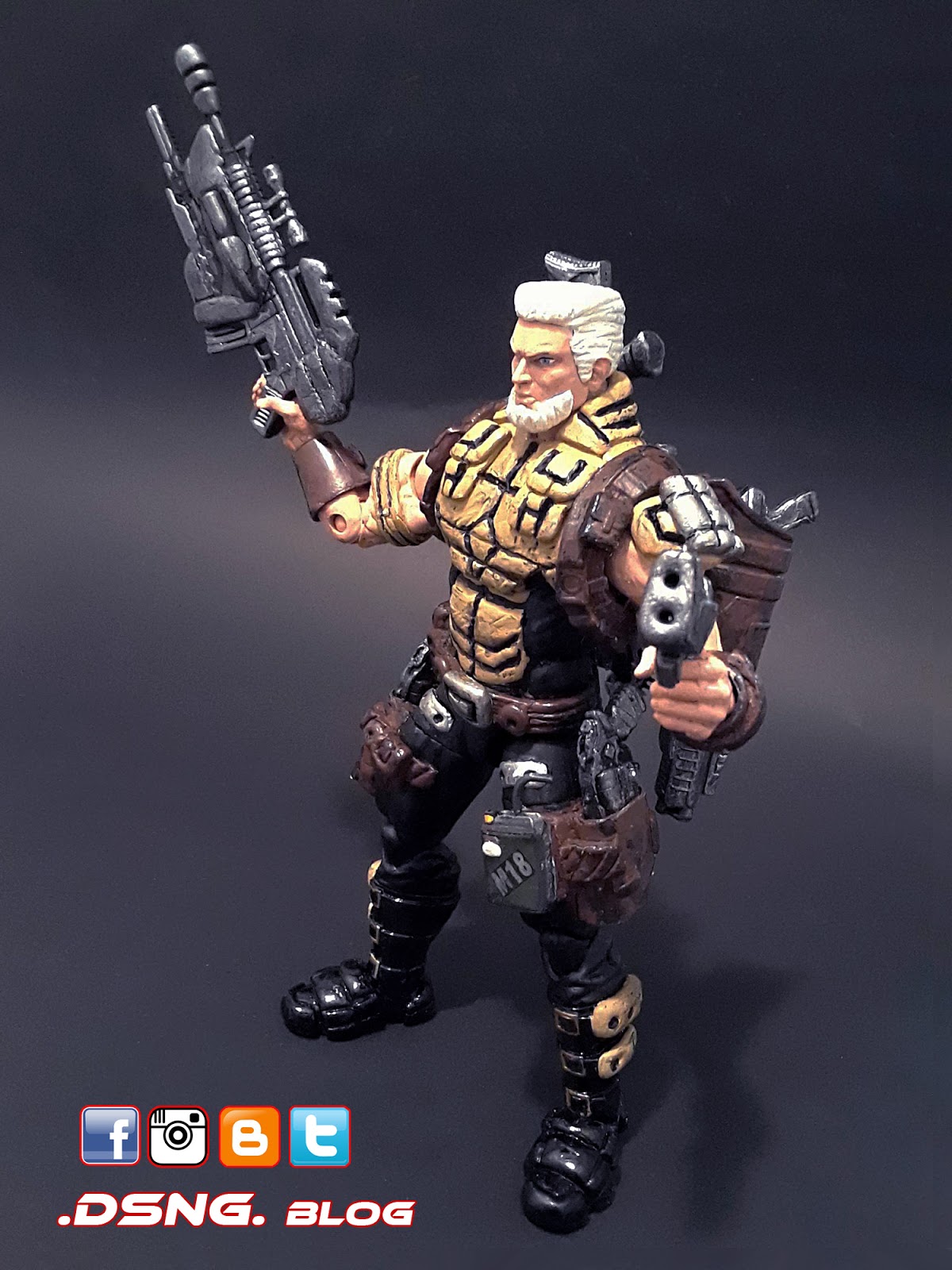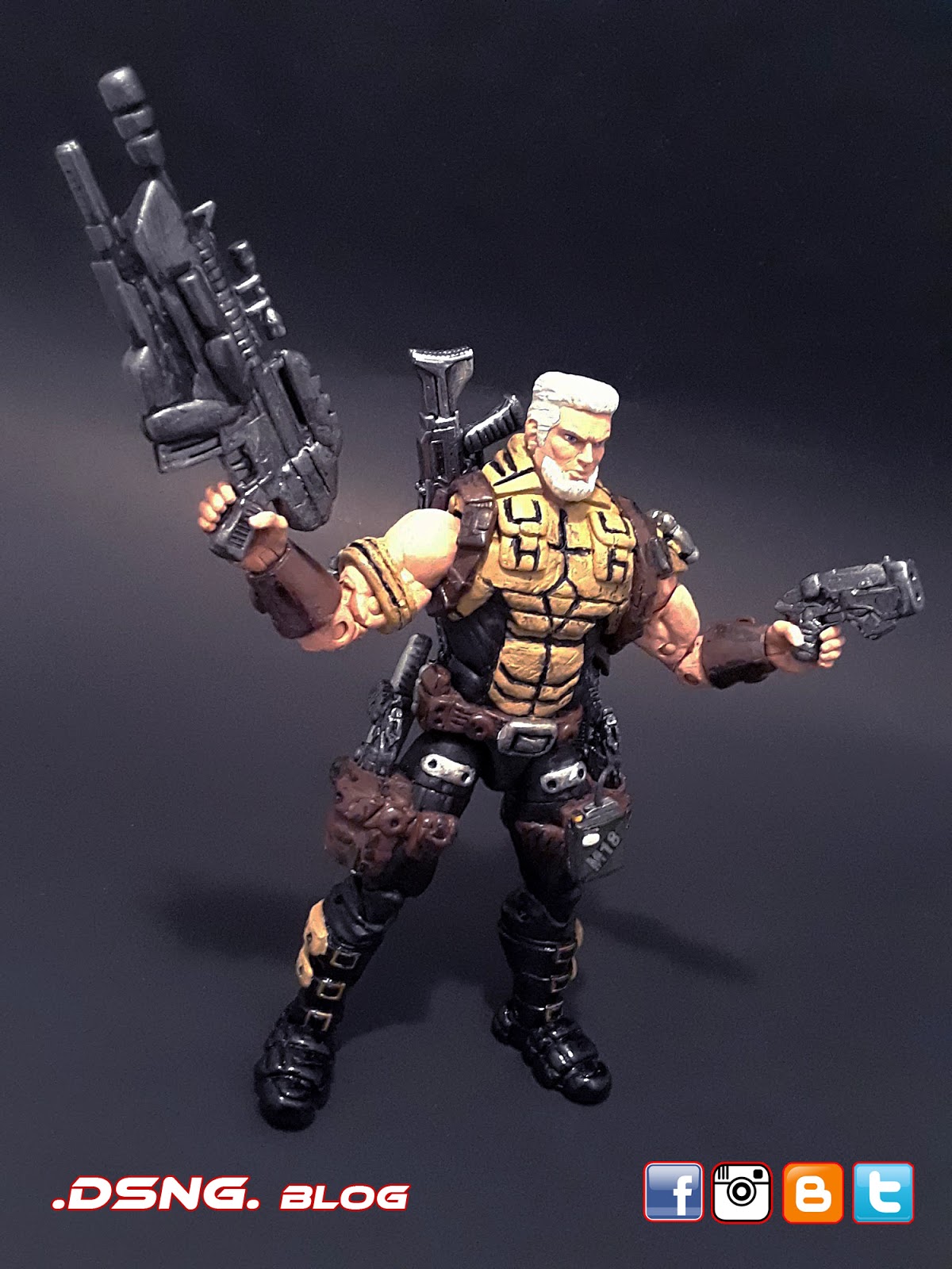 The handguns came from ebay, and one rear rifle came from a Gears Of War toy. Some of the guns were heavily modified with putty as well. His gun-vest came from Bishop and his ax weapon came from Thor, the base model.