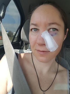As I finally emerged from the room (cancer free!) and told him that we were officially able to go home, he relaxed a little and breathed an audible sigh of relief. The couple we had been chatting with in the waiting room - interestingly, a husband and wife from our very small town! - were happy for us but a little bummed that they weren't able to leave yet. Also, they were impressed with the immediate swelling and bruising of my face. "You'll have to walk around town telling people Boogie did that to ya!" the woman joked.