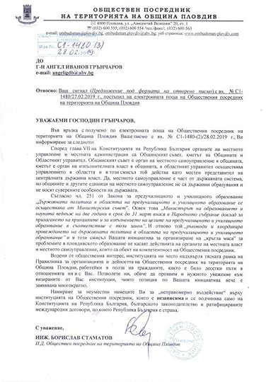 Ето какво омбудсманът на Пловдив отговори на вчерашното ми писъмце до него...