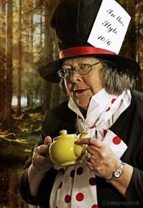 Here’s me dressed up as the Mad Hatter from Alice in Wonderland, photo taken by Kim Ayres for the Wigtown Book Festival a few years back.