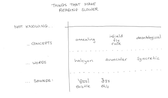 This is obviously a problem when you’re reading in a second or third language. I read in Chinese and Spanish much slower than in English because many of the words I either do not understand, or they’re being used in a way that doesn’t make sense given my mental definition of those words.