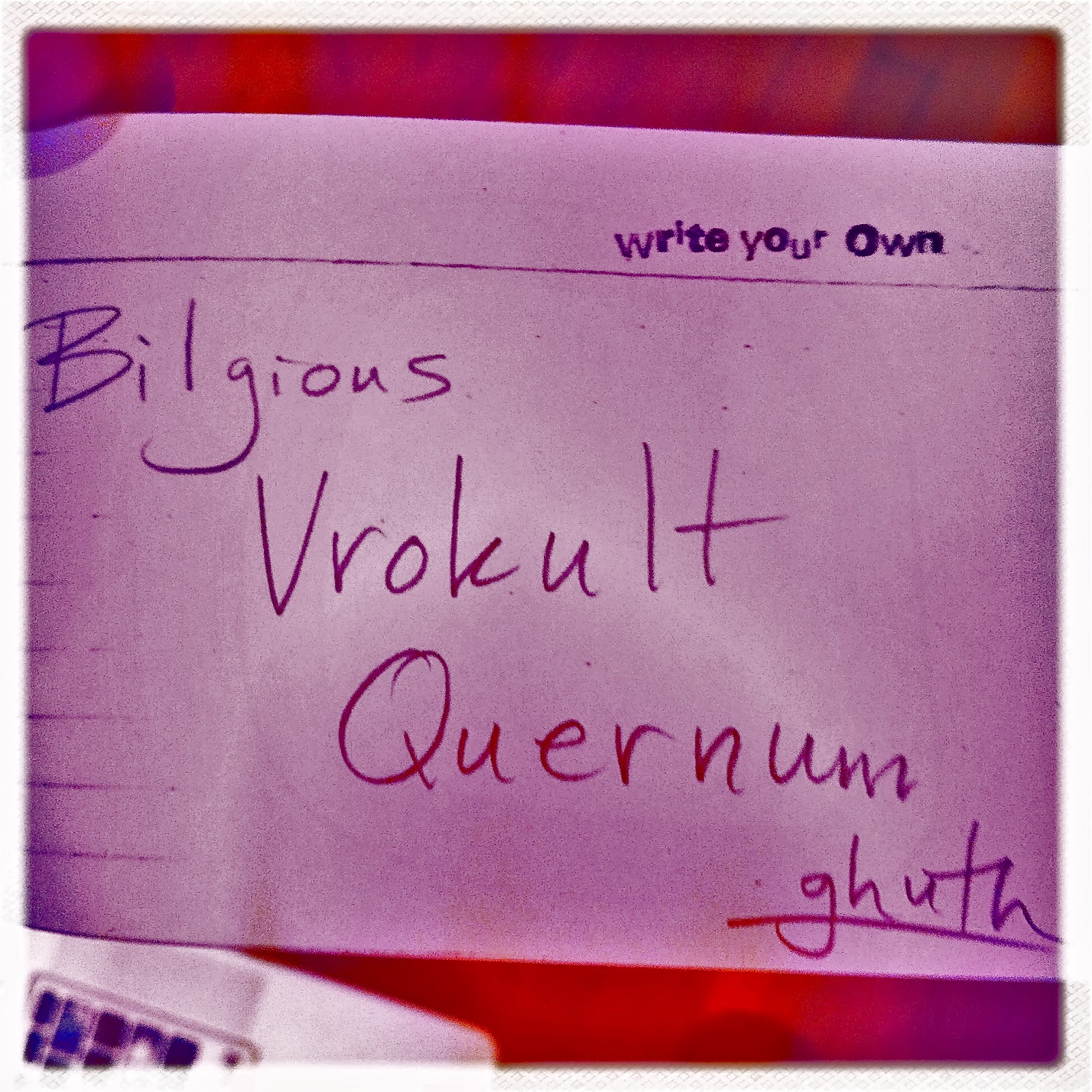 Geof Huth, "Bilgious" (a poem written in a book of neo-Dada poetry tonight, 30 November 2011)