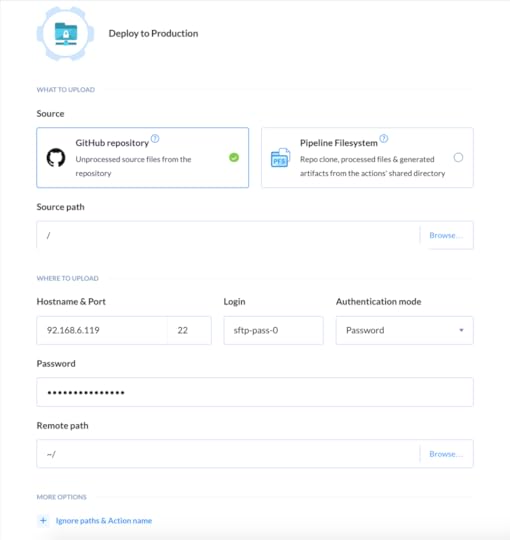 Konfiguracja kolejnych kroków jest bardzo łatwa. Przykładowo, jeśli chcemy zrobić deploy na serwer SFTP, wyszukujemy go na liście, wpisujemy dane autoryzacyjne, ścieżkę docelową na serwerze i… tyle – Buddy automatycznie zuploaduje zmiany na serwer po pushu.