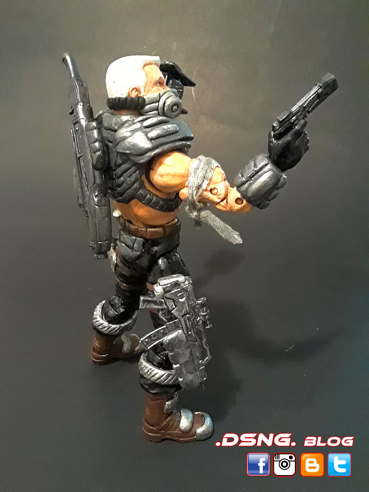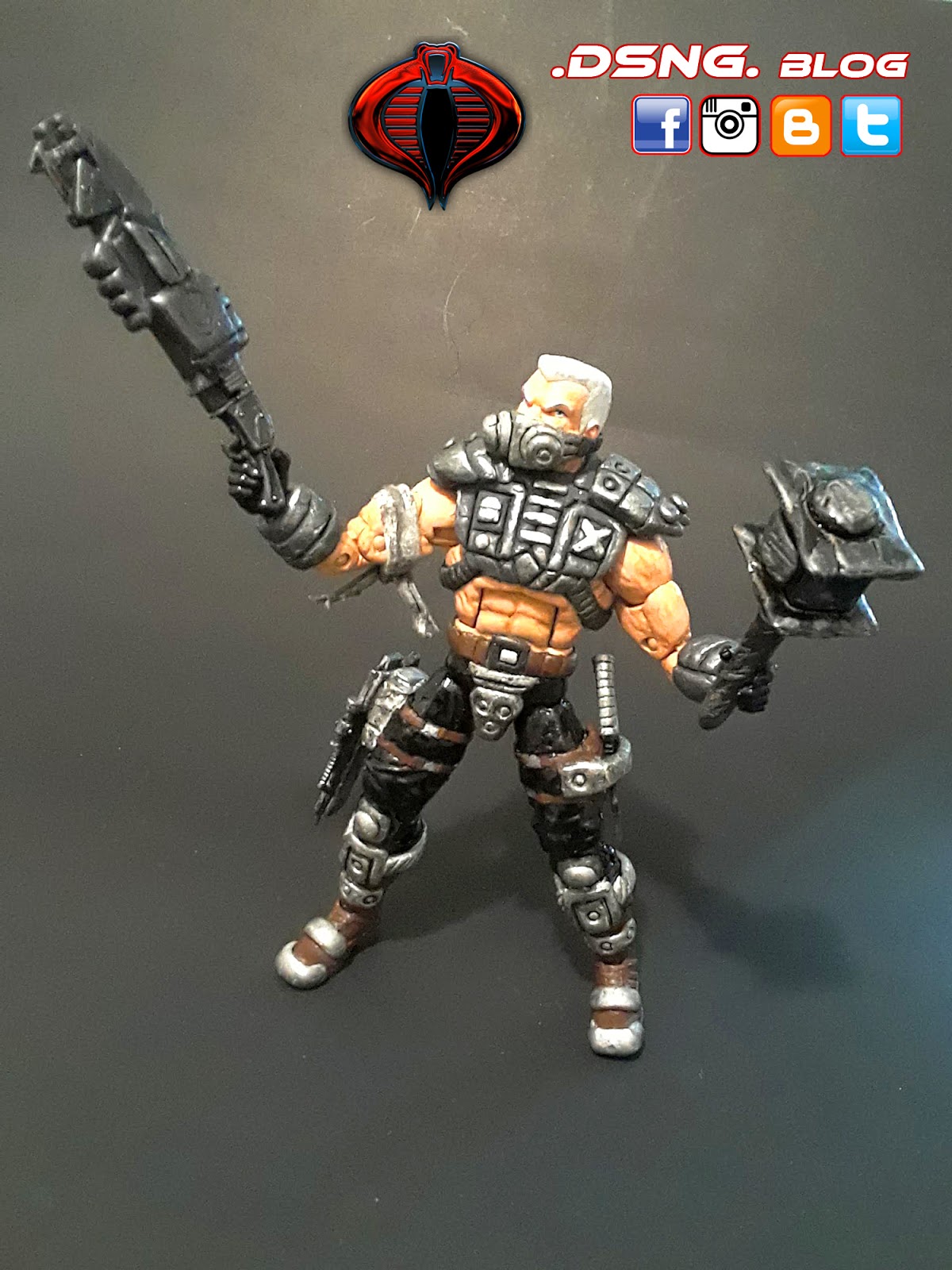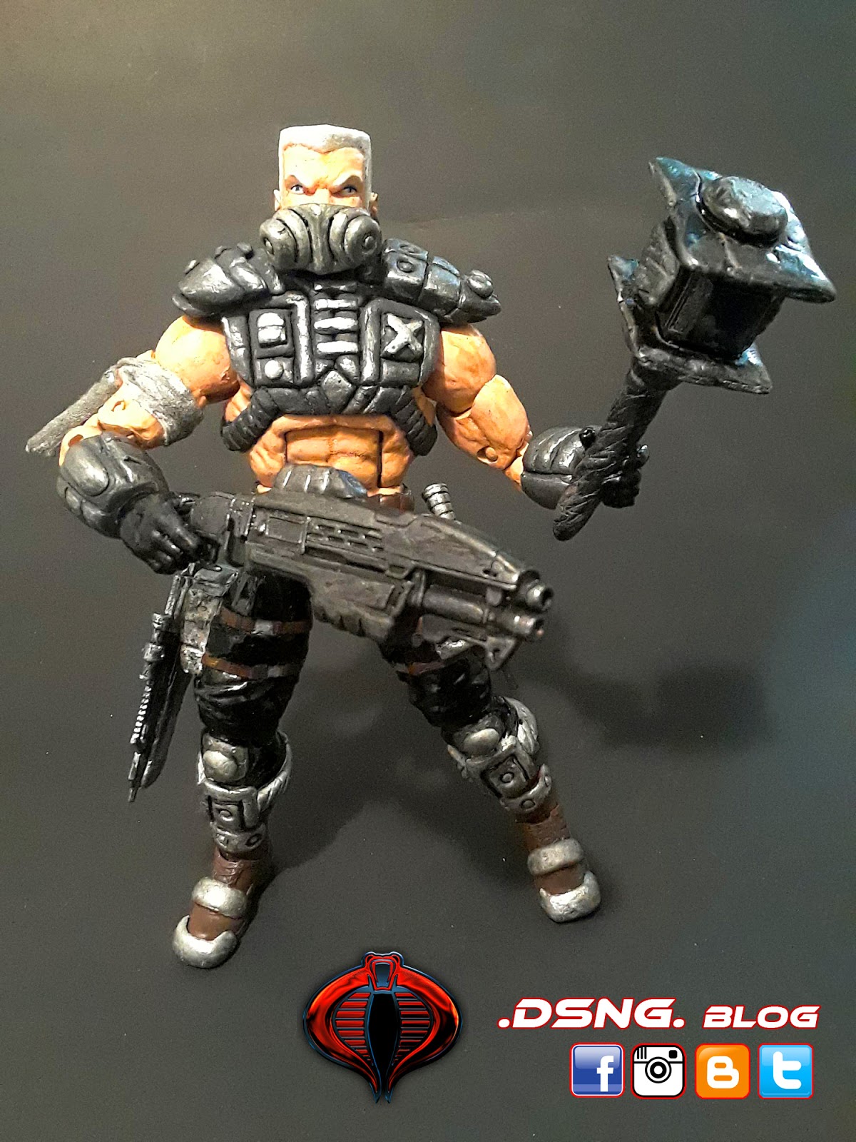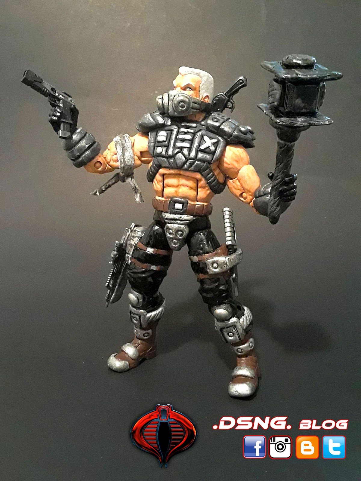 This tough guy took a long time.... Finally done with Road Pig from the Dreadnoks Cobra biker gang in G.I.JOE! Base body was Marvel Legends Nuke. Sculpted his entire body armor and boots. Weapons were from ebay and were modified. The dagger came with the toy. Hammer was modified from Thor. Sculpted his face mask and colored hi with Tamiya paints. The very last pic shows his arm tattoo, just like in the 80s cartoons. He has 4 guns and 1 dagger [one of his guns was not shown]. The sculpting phase was shown over HERE. Enjoy and Share!