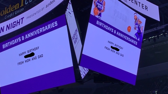 She's at the King's Game with her father-- he upgraded his tickets so they're near the arena and he had her name up on the marquis.