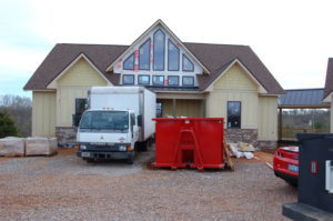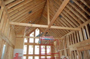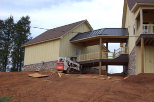 Then we went to meet the builder at the house. We’d already stopped by the night before, but had some questions for him. Workers were there installing insulation. We used our paint chips to decide on the specific exterior colors (as in, other than “brown”). Since my last update, the stone has been added, deck railings mostly finished, and more of the shake siding on the center section that hadn’t been completed yet. The metal roof over the breezeway and part of the porches is done. They also put the hot tub on the porch, since it will be much more difficult to move it there once drywall goes in (soon!). Fireplace inserts were also in, and more work on the plumbing and electrical.