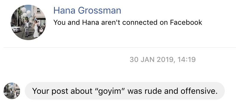 Gotta tell you, most of my posts on Hevria don't get much mileage in terms of feedback -- that's mostly for Elad and his political ilk (politilk?) -- but this was the exception. Posted this and, the next time I checked Facebook (I've been staying off Facebook for the most part, because Russians), I got this rebuke from someone who, I'm not sure if they're Jewish or not, but her name is Hana Grossman: