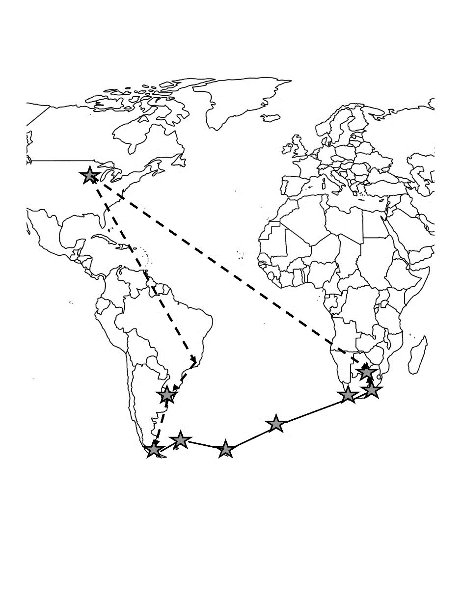 This was a self-planned operation with an exploration  cruise in the middle.  I flew from Minneapolis to Atlanta to Rio to Montevideo.  Then we rented a car and drove up to Punte Del Este.  Then after seeing Uruguay, we drove to Montevideo caught a ferry to Buenos Aires before catching a flight to Ushuaia.  After spending two days driving around Argentina's southern city, we caught a boat, which toured 5200 miles to Cape Town via the Falklands, South Georgia, and Tristan ending up in Cape Town.  We drove over 500 miles to Port Elizabeth, being 9311 miles from home at our farthest point on the Indian Ocean.  We flew to Johannesburg and drove to Pretoria and a week later flew 18 hours to Minneapolis and drove 7 hours to pick up my truck and the dog and got home, seven weeks later.