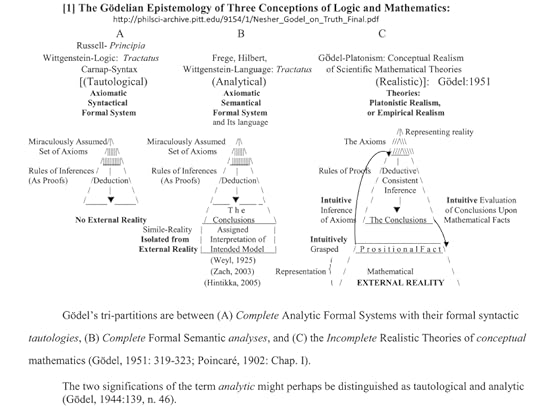 Nesher’s summary of Godel on epistemology of Math. Note, under C there is a gap between what proofs access on a coherent axiomatisation and actually accurate facts on mathematical reality. Notice also rational intuition as a primitive of Mathematical contemplation.