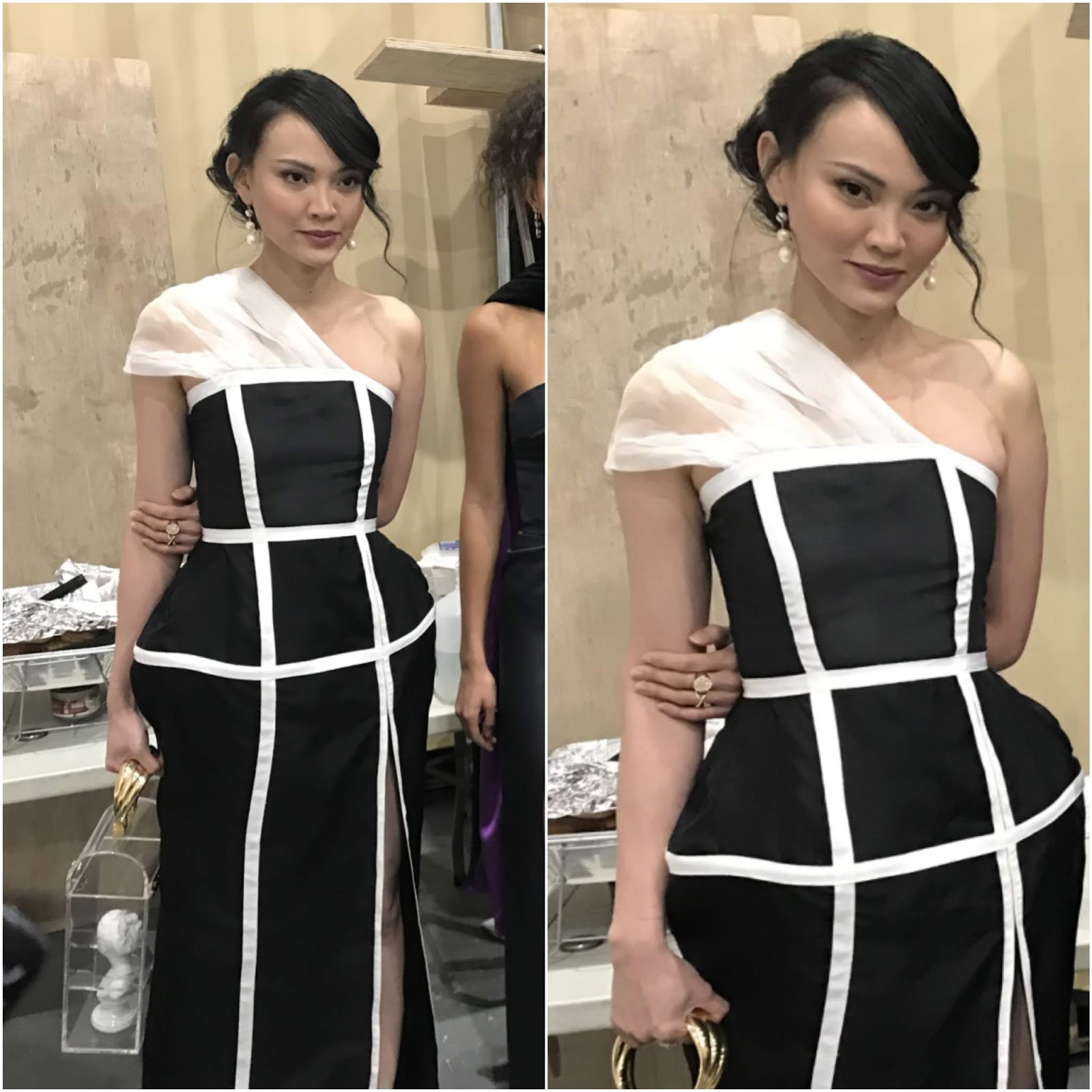 Black-and-White Goddess--Model Yuen Sze Jia in black-and-white gown from Lela Orr inspired by white porcelain statue--Bravo's "Project Runway" Season 17, Brooklyn New York