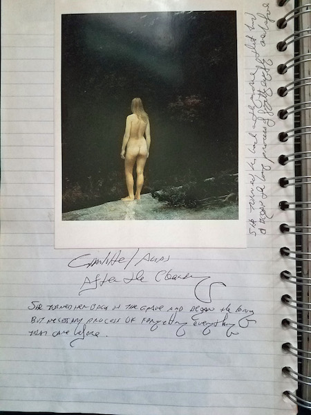 You may well recognize the image as being one of Andrew Wyeth's paintings. It's a postcard I bought at the Brandywine Museum specifically for the Image Book. A bit more sexualized than I'd prefer for the character. But, like the goddess Inanna, she makes a voyage to the depths, surrendering a piece of her armor at every stage.