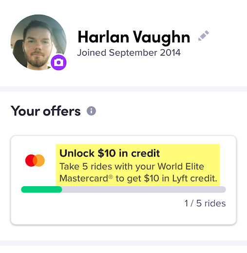 If you have a World Elite Mastercard and link it to your Lyft account, you’ll get $10 in Lyft credit for taking 5 rides in a month. World Elite Mastercards include: