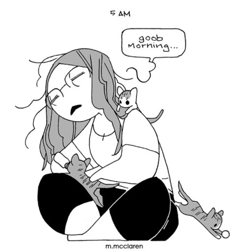 [Description: Three comics detailing my time fostering kittens. The first cartoon shows me at 5 am, bottle feeding the kittens and saying ‘goob morning.’ I look exhausted.