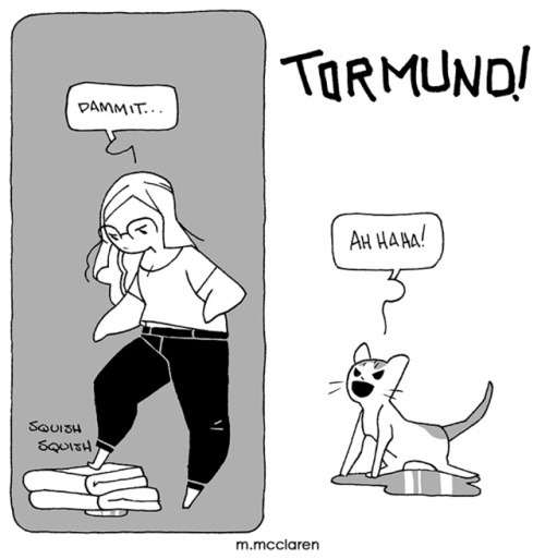 The second cartoon shows me poking a pile of towels with my foot and saying ‘dammit.’ In the next panel I am yelling at Tormund, who is peeing on the floor and laughing.