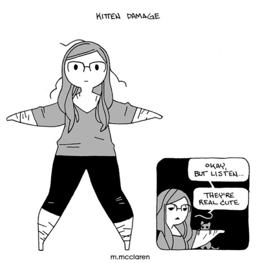 The third cartoon shows my ‘kitten damage.’ There are scratches on all my limbs. In a smaller panel I hold out an arm with a kitten scratching it. I look remorseless as I state ‘Okay, but listen… they’re real cute.’]