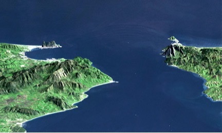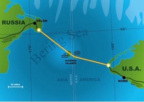 With the two Diomede Islands halfway between the peninsulas, the Bering Strait could be spanned by a bridge/tunnel network with one long 25 mile bridge connecting Alaska and the Diomede Islands, and a tunnel connecting the Diomede Islands with Russia.