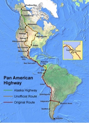 The Pan-American Highway now consists of over 19,000 miles of roads ranging from Prudhoe Bay in northern Alaska to Ushuaia, Argentina on the southern tip of South America, with only one short piece missing in the middle.
