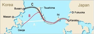 Several routes have been considered for the Japan-Korea bridge-tunnel.