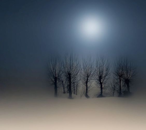 As she drew closer she could see it was a stand of trees, a small copse forming a tight circle. Maybe she could shelter inside, but there was something odd about them; despite the snow everywhere they had none on them. There was no breeze shifting the dense fog, so what had moved the snow off? Their sharp twig-like branches reached up to the skies resembling people up in arms, frozen in mid argument. There was no rustle from the branches, the snow and fog muffled everything.