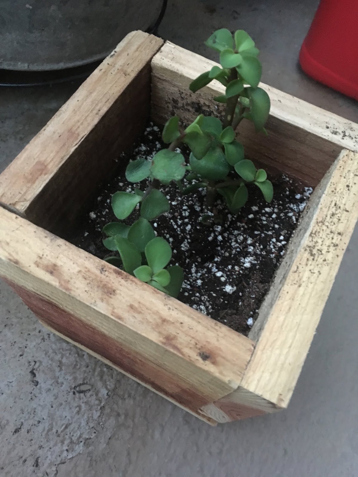 The teacher gave us all wooden planters and some cuttings. I planted them on Wednesday and so far, it looks like the jade plant might make it. And my kale and radishes are starting to sprout.