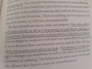 God allows suffering for a purpose. He may allow us to suffer in order to show us a different facet of His character. He may want to use our experience to later comfort and guide someone else. He may put us in a difficult situation specifically to guide us somewhere we never would have gone otherwise. He may use our suffering as our platform, a way to give us credibility that will draw others closer to us and to Him. But it always has a purpose, and it can almost always be used positively in someone else's life if we let it.