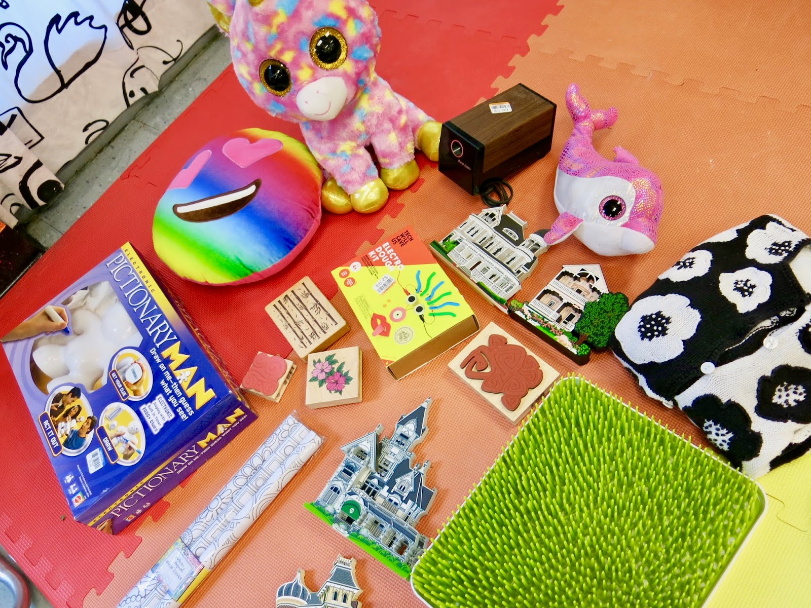 Things I always look for: funky clothing, stamps, clay tools, stuffies that are cute (or rainbow-y!), games for my early finishers, PENCIL SHARPENERS!, those bottle drying things which are perfect for paint cups!