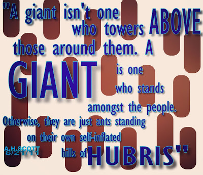 "A giant isn’t one who towers above those around them. A giant is one who stands amongst the people. Otherwise, they are just ants standing on their own self-inflated hills of hubris". - A.H. Scott 8/21/11