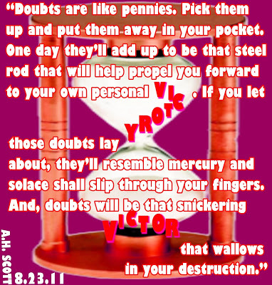 “Doubts are like pennies. Pick them up and put them away in your pocket. One day they’ll add up to be that steel rod that will help propel you forward to your own personal victory. If you let those doubts lay about, they’ll resemble mercury and solace shall slip through your fingers. And, doubts will be that snickering victor that wallows in your destruction.” - A.H. Scott 8/23/11 #NYC #quotes #doubts #victory #graphics #design