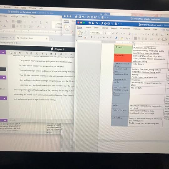Here’s some of the prework I did overlaid on top of the text of chapter 2. The top document with the colored column contains a lot of Susan May Warren’s plotting ideas. I learned so MUCH from her again at ACFW this year. Any time I can take a writing class with her, I do. I always come away with tips and strategies I can apply immediately to my writing.
