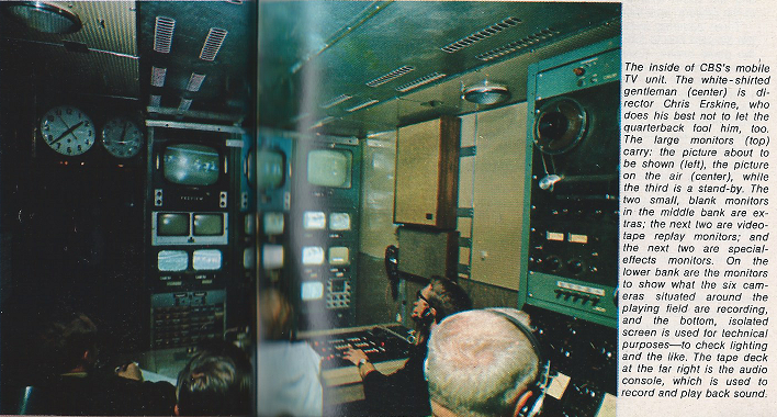 Covering football has changed dramatically over the years. There are five color cameras assigned to the game: three near the 50-yard line, one on the sidelines, one behind an end zone. (By contrast, the average game today uses at least twice as many, and NBC has 40 for its Sunday night broadcasts .) CBS gets off to a rough start; despite Gifford's warning that Steelers running back Dick Houk had the capability of throwing on the option play, the cameras miss his 62-yard pass on the game's first play. Later in the first half Erskine cuts to the field-level camera as Giants quarterback Fran Tarkenton unleashes an 84-yard pass to Homer Jones; the ground shot "projects the speed and power of the players but loses a panoramic view of the field," blowing the live shot. An instant replay showing the completed pass doesn't make up for Erskine's frustration at missing the original play.