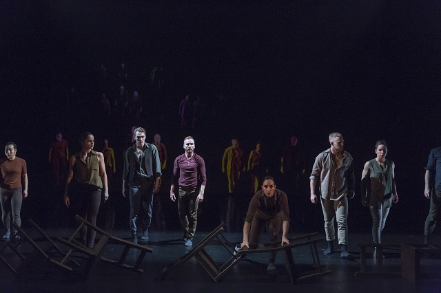 Like the costumes, the staging is spare, occasionally using a row of wooden chairs as props. A little smoke, and coloured lights shining from offstage, were all that was needed to create atmosphere. The lighting is dramatic, enhancing the movement with a play of shadow.