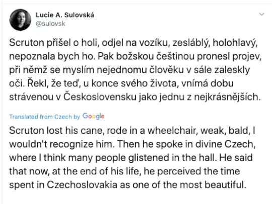 Last night in #Prague: tribute to Sir @Roger_Scruton for his support of Czechoslovak dissent before 1989. Awarded Medal of the Czech Senate. Under auspices of @ecrgroup, sponsored by @AlexandrVondra, Veronika @vrecionova, @EvzenTosenovsky + me. Very emotive + moving. pic.twitter.com/nQRm7XzDeQ