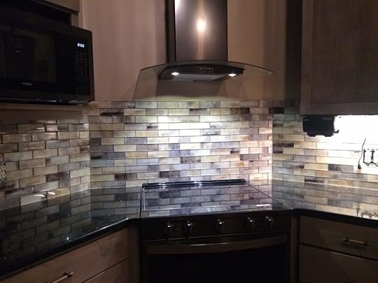 No, I didn’t walk backwards into a pond (that would be cold now!). But that’s what’s been going on this week. My husband tiled our kitchen backsplash wall this week, one of many little tasks we didn’t want to pay the builder to do. I helped a little. It’s glass tile, so will be easy to clean. I’m very happy with how it turned out!