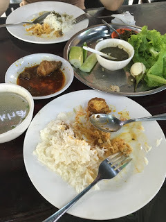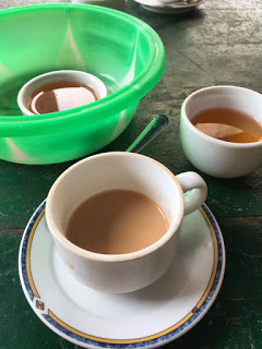 After a first round of walkabout, it is time for a shady street and food. The centerpieces of Myanmar cuisine are rice and curry. The curry here is not as fiery as Thai curries, nor as creamy as Indian curries. The Myanmar curries are cooked "until the oil comes," a separation of the oil used to make the curry paste. The curry and rice are accompanied by soup, a platter of fresh vege and greens, and an ever-changing variety of condiments served as small side dishes. A full meal of curry with all the fixings will set a hungry traveler back about 3000 Kyat, or a bit less than two dollars.