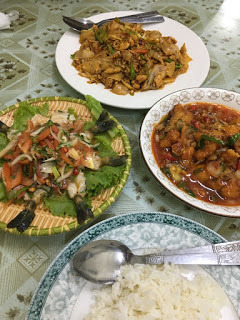After a long rest, we ventured out for our evening meal. Both of the places I had researched were closed, but we were rewarded for rolling with adversity. We found a small joint on a narrow side street, a Halal Chinese place. I did not know that such a combination existed, yet here we were. The food was so good we went a little crazy, spending the princely sum of ten dollars for dinner for two. Everything was exquisite, from the prawn salad to the fish stew.