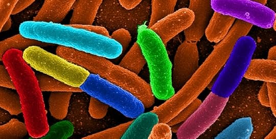 A false-color scanning electron microscope image of Escherichia coli. The different colors represent bacteria with different traits.