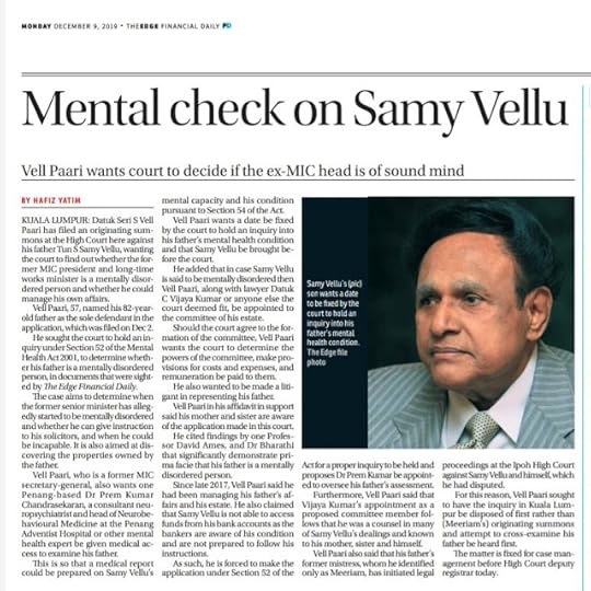 That brings us to the case above. Samy Vellu used to be the de facto head of Indian community in Malaysia. Passionately referred to as 'Uncle Sam', he was the darling of the Malaysian media of the 1990s and the butt of many of the political jokes of the day. His awkward pronunciations and his recurrent attributing many of his department's follies to 'act of God' still rings a bell. He had also sarcastically accused many Malaysians of being mentally deranged and need to be hospitalised.