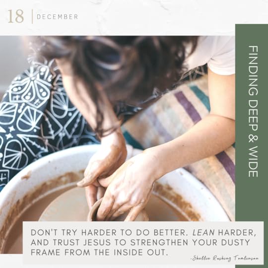 We don’t want to try harder to do better, remember? We want to lean harder, and trust Jesus to strengthen our dusty frames from the inside out. We’re learning to say yes and amen to Jesus’s word, “Without me you can do nothing!” We’re learning we can’t...