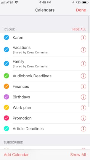 As soon as I know I’m going to an activity or am taking a trip, I add the function on my calendar with 1 or more reminders before the day. I’ll be able to look forward to events and schedule my other activities around them. Though we’re not even a week into the new year, I’ve already scheduled trips to NY in March and May for multiple audiobook events, participation at VOAtlanta Audiobook Academy in March, and attendance at the play “Hamilton” when it tours here in Atlanta in April. When planning travel, I copy all of my confirmation emails to Evernote and fill out my Evernote trip itinerary template with all the pertinent details and links to those emails.