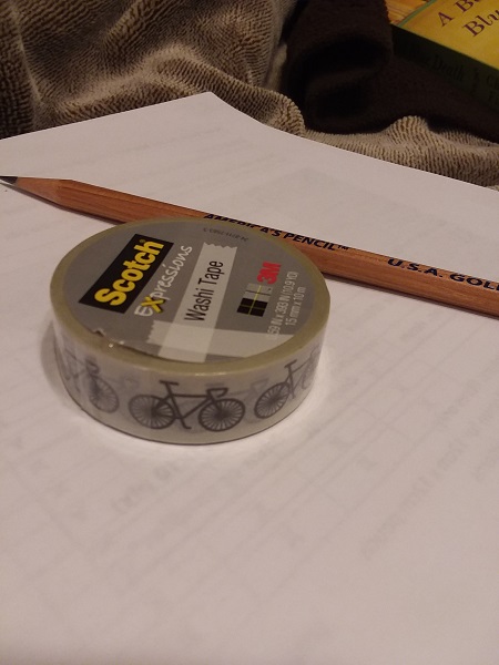 Item #32 - outrageously expensive tape. I bought this roll of decorative tape at Target along with a whole bunch of other school supplies. It was in a big bin with no price label, but when I got home and checked the receipt I noticed I had spent FOUR DOLLARS for this stupid tape. Never used. Get it way cheaper than four f*%$# dollars. Decorated with bicycles. (pencil for scale)